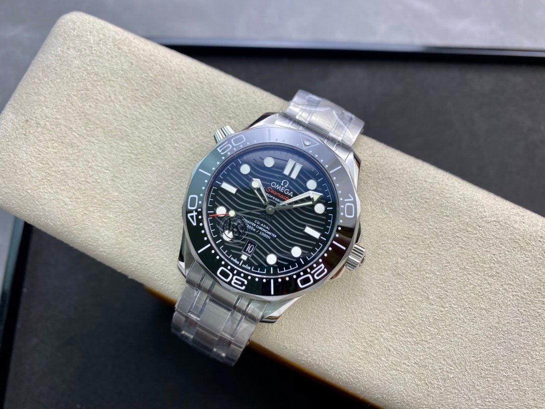 OMEGA Seamaster Diver 300M 42mm Black Dial is a high-quality 1:1 Superclone watch that is very close to the original. It has a 42mm stainless steel case, a silver ceramic bezel, a black dial with wave pattern, and a date window at 6 o'clock. The watch is powered by a Swiss Eta automatic movement that is decorated to look like the Omega Co-Axial Master Chronometer movement. The watch also has a sapphire crystal and a water resistance of 300 meters.