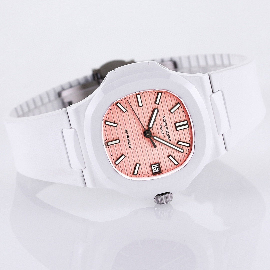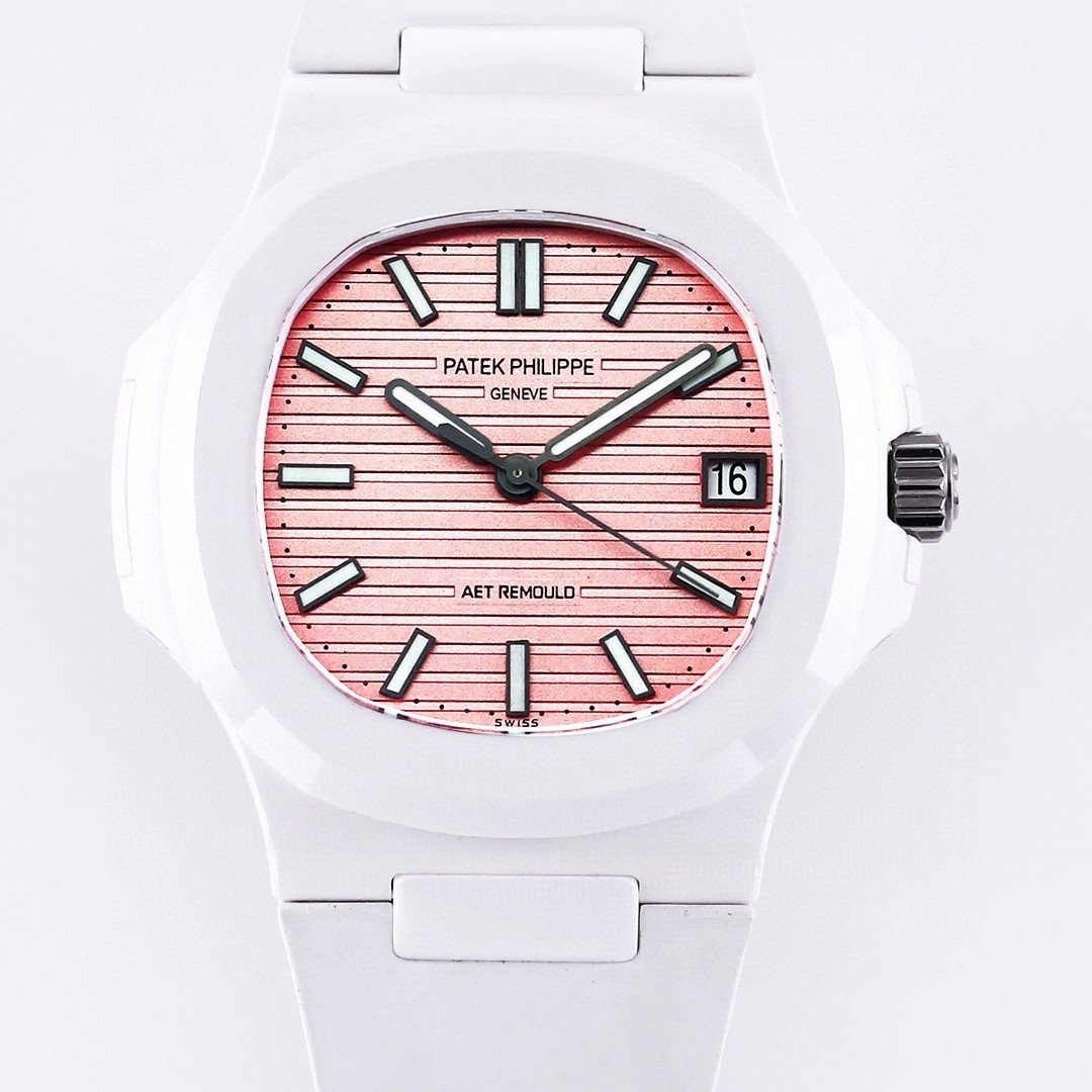 AET remould Patek Philippe ceramic Pink dial with strap is a 1:1 superclone watch. It is made with the same materials and to the same specifications as the genuine Patek Philippe Nautilus 5711/1A-018, except for the movement, which is a cloned movement instead of the genuine Patek Philippe Calibre 26-330 S C.