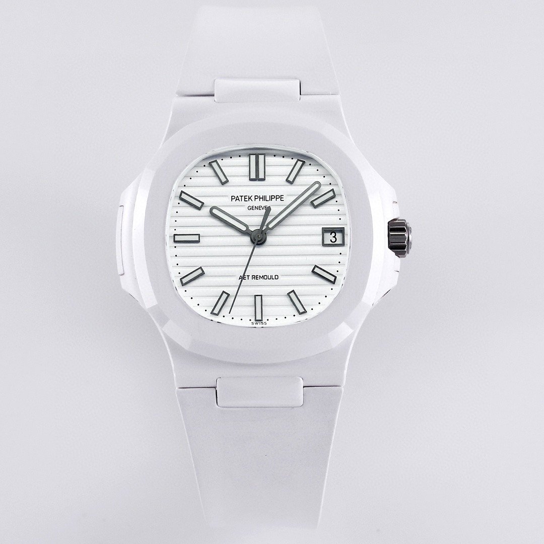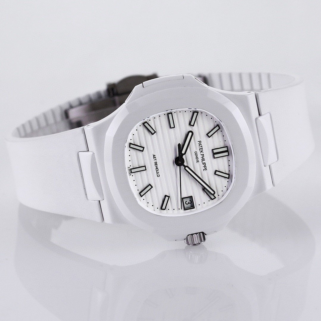 AET remould Patek Philippe ceramic white dial with strap is a 1:1 superclone watch. It is made with the same materials and to the same specifications as the genuine Patek Philippe Nautilus 5711/1A-018, except for the movement, which is a cloned movement instead of the genuine Patek Philippe Calibre 26-330 S C.