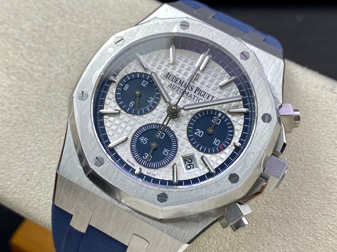 Audemars Piguet Royal Oak Chronograph REF. #26331ST.OO.1220ST.03Genuine Swiss 7750 Movement re-aligned to resemble the 3126 Audemars Piguet Movement with Functional stopwatch feature like the Authentic Silver Toned ??Grande Tapisserie?? dial with 3 Functional Sub Dials and Date Window.904 L Steel Case Complete with AP MArkings and Engravings.Scratch Proof Sapphire Crystals with Correct Date Cyclops and Double AR Coating 904L Stainless Steel Strap completed with AP Markings and Engravings as per the originals and AP Folding Clasp 42MM in Diameter x 16MM Thick Sapphire Crystals complete with AP markings and Engravings Exact Weight and Dimensions to the Authentic Watches Water Resistant and Waterproof up to 50 Meters Free Shipping on this item worldwide - For more information please contact usThe Images you see are of Actual Watches, You will get exactly the same watch you see in the Images