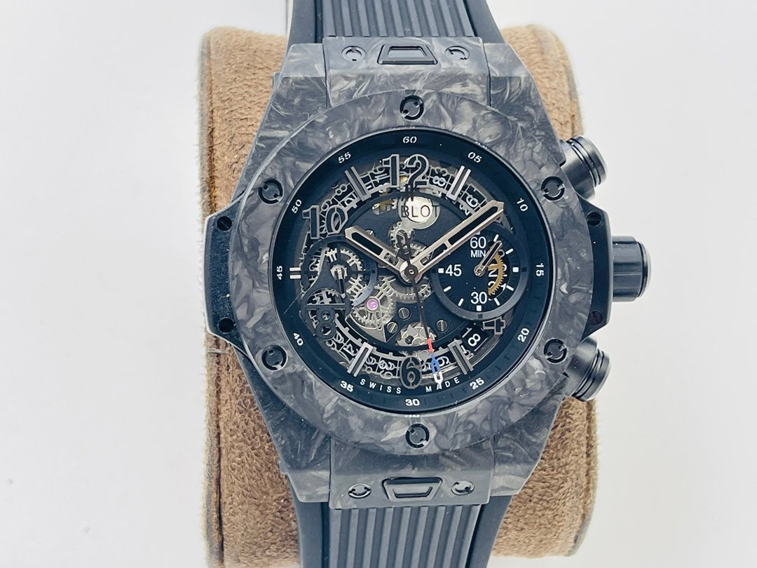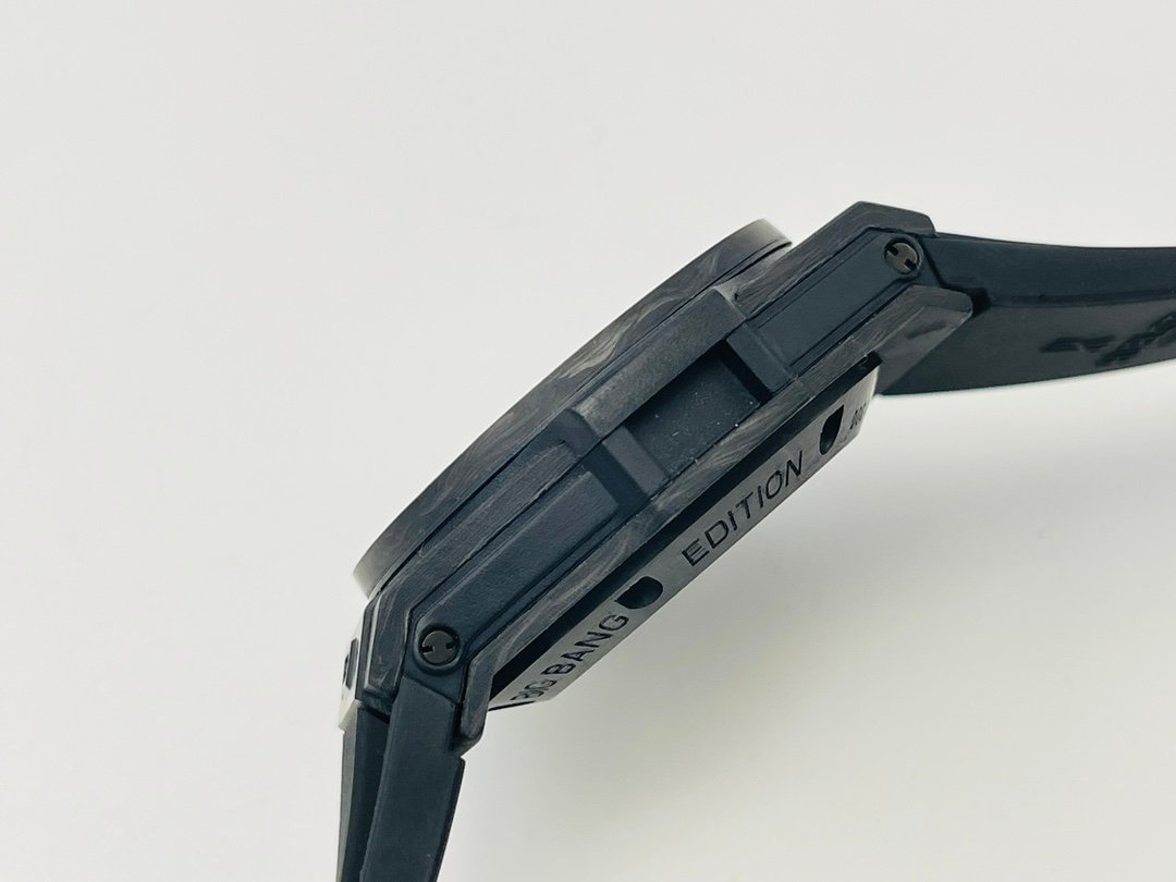 The new model follows the big bang series and is made of special carbon fiber materials. Yubo watch is equipped with 7750 modified "hub1242" automatic movement, which can be clearly seen through the watch case, and the beauty of extraordinary mechanical structure can be seen at a glance.Big bang series carbon fiber wristwatch adopts bold red, blue and black, showing an amazing strong visual impact effect. The internal precision mechanical structure is clearly presented through the watch case. The design of pointer and hour scale makes the whole surface send out a strong sense of rhythm and architecture, showing the extraordinary charm of time. The watch is equipped with a 30 minute timing dial at 3 o'clock and a second hand dial at 9 o'clock, which echoes the logo of Hublot Yubo watch at 12 o'clock.Watch with black structured rubber strap. In addition, the watch is equipped with a "one button" quick strap change system. The wearer can easily and quickly replace the strap with one click!!!p