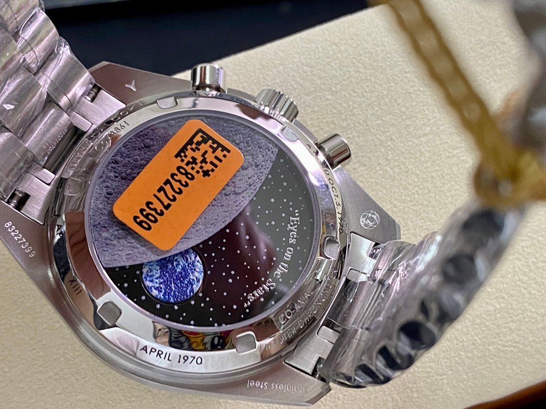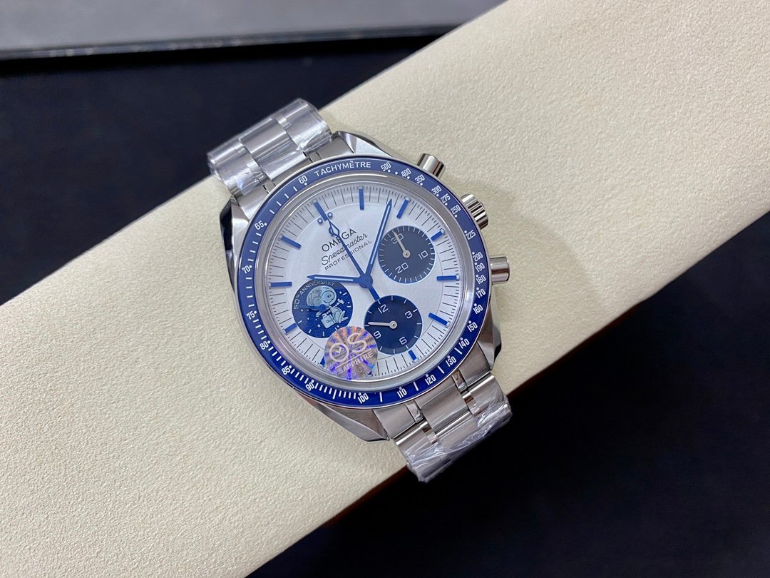 Omega Snoopy 150th Anniversary watch is a high-quality 1:1 Superclone of the original Omega Speedmaster Silver Snoopy Award 50th Anniversary watch. It features a 42mm stainless steel case with a black ceramic bezel and a Hesalite crystal. The dial is black with a silver Snoopy logo and a moon phase display. The watch is powered by the VS Factory 3861 automatic movement, which is a clone of the original Omega Co-Axial Master Chronometer caliber 3861.