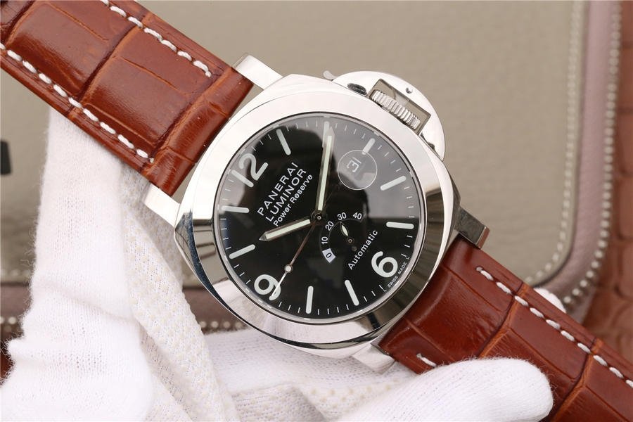 44 mm polished stainless steel case. Automatic movement with power reserve and date function. The black dial is balanced with the power reserve indicator placed over 6 o'clock. Original croco leather strap and rubber strap with Panerai stainless steel buckle. This watch was only produced for two years in a very short run. The first series (the A series) had a tritium dial and silver arrow, while the second B series had a luminova dial.