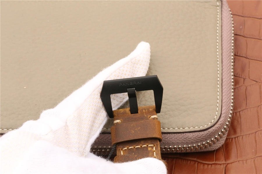 Genuine Leather Strap equipped with Stainless Steel V Buckle with Panerai Markings/Engravings. Flush Lug Screws