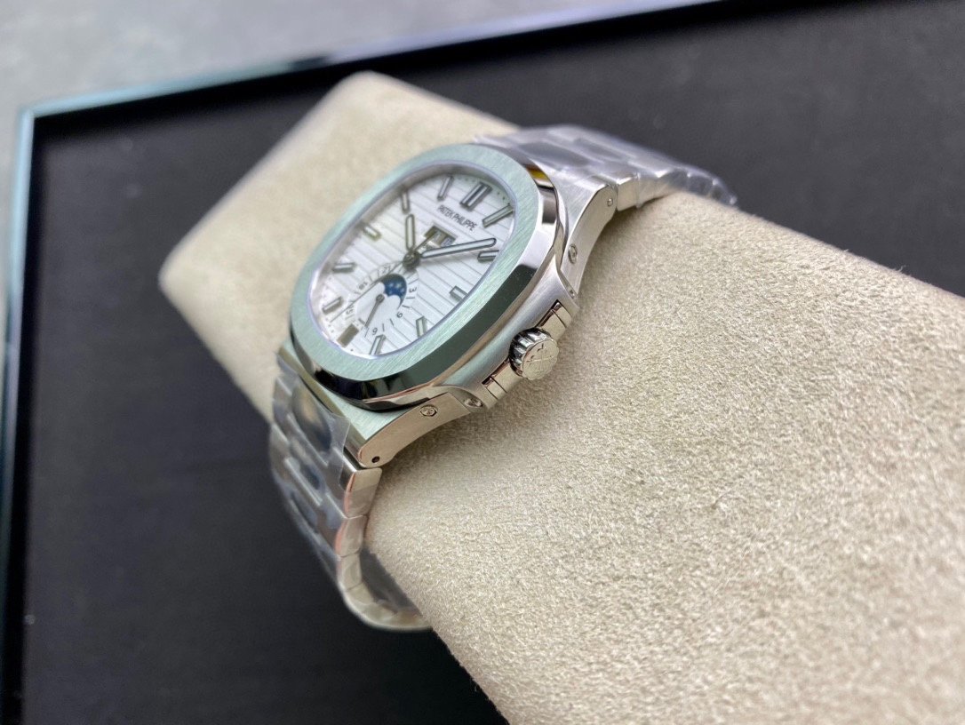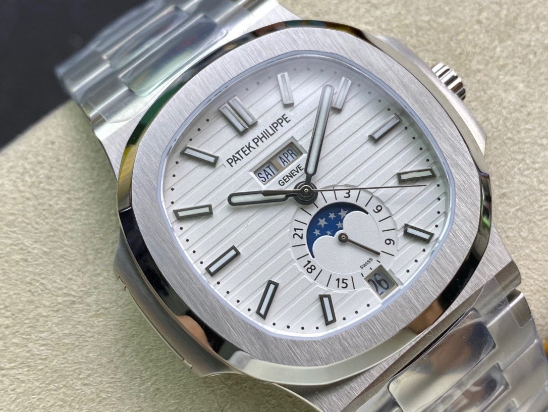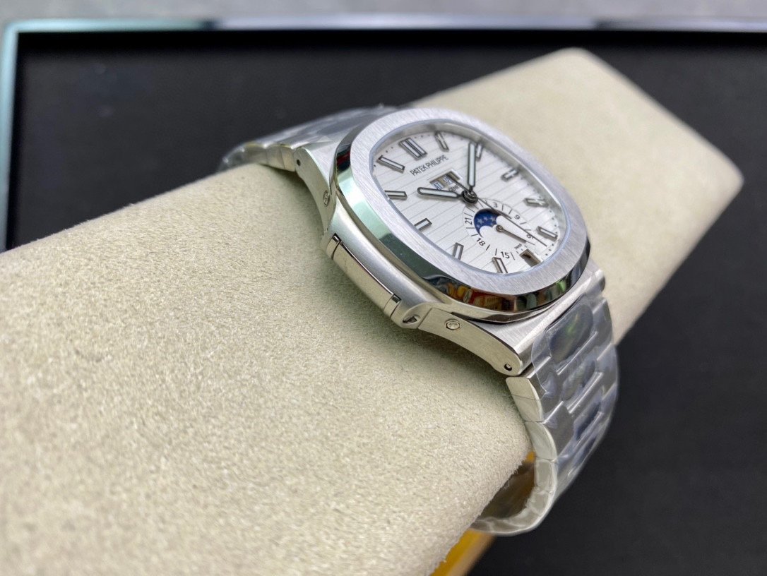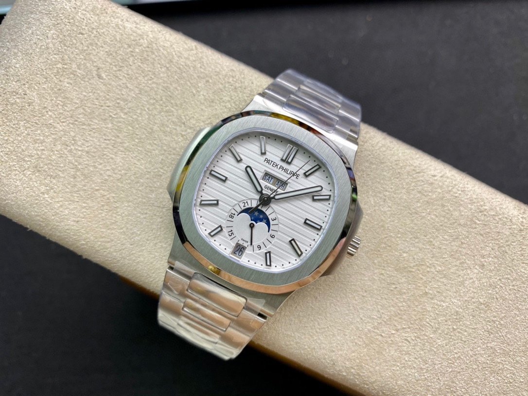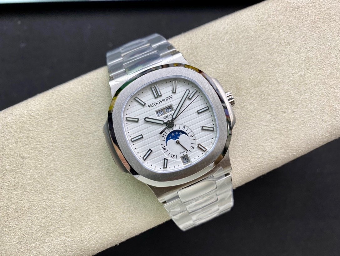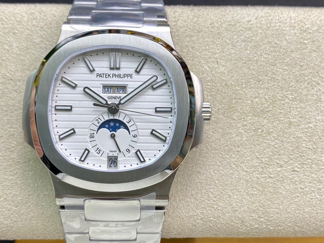 Patek Philippe Nautilus Annual Calendar 5726. It is a high-quality 1:1 Superclone of the original Patek Philippe Nautilus Annual Calendar 5726. The watch has a stainless steel case, a White dial, and a self-winding movement. It is water resistant to 120 meters.