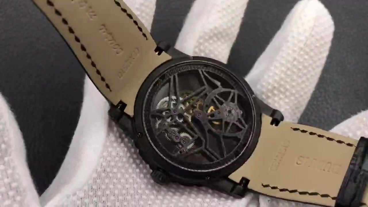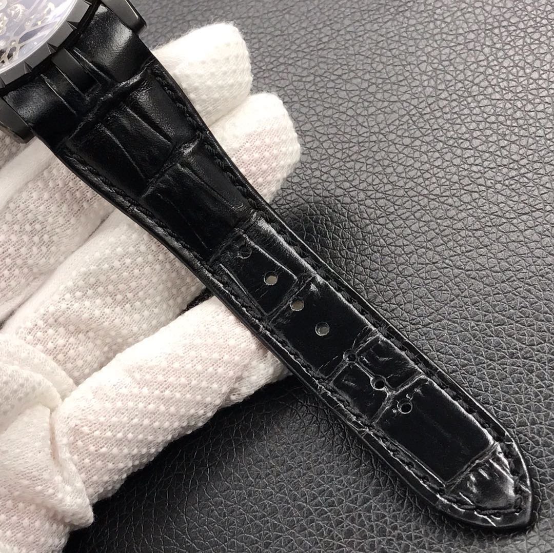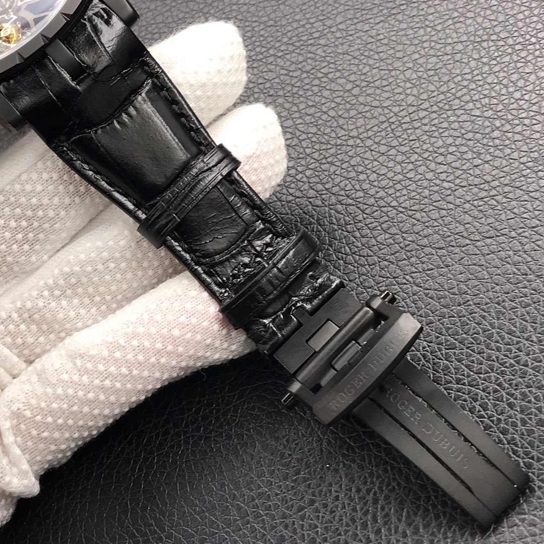 The BBR Roger Dubuis King Series Titanium Tourbillon Model: RDDBEX0479 is a high-end Superclone watch that is made to resemble the original Roger Dubuis King Series Tourbillon watch. It has a titanium case that is 45mm in diameter and 13.5mm in thickness. The watch is powered by a seagull custom RD505SQ winding movement, which is accurately adjusted in six directions and has a power reserve of up to 50 hours. The dial is hollowed out and features a luminous scale, black DLC coating, and a second dial in layered titanium. The hands are covered with a luminous coating for easy and clear reading. The watch is also equipped with a sapphire crystal glass with anti-glare coating and a natural rubber strap imported from Germany.