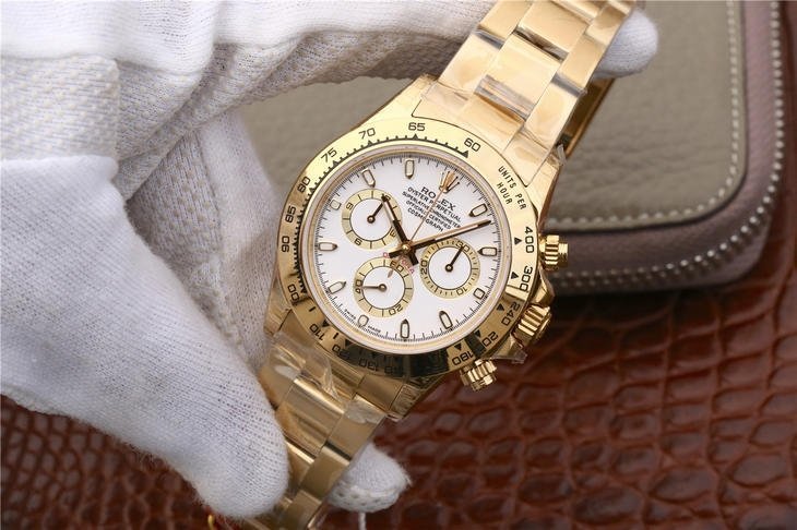 18K Yellow Gold Plating on 904 Solid Stainless Case with Rolex Markings and Engravings like the Authentic.The Best Rolex Daytona Model Replicated up to Date. The First Rolex model to adopt a 904L Steel on Casing and Strap which is the same steel used by Rolex. Compared with an Original Side by Side and there were NO Differences Whatsoever. Complete list of details have been stated below and you will see that tremendous amount of detaiing and work has been put into this edition.